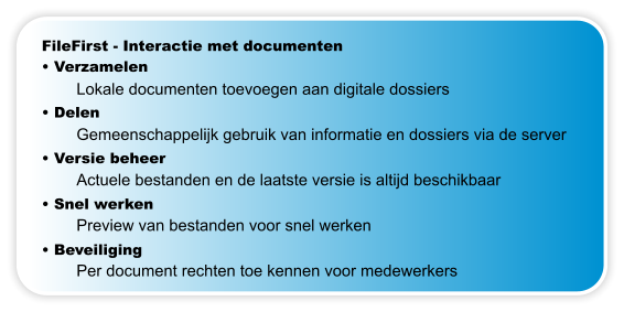 Digitale dossiers zijn in opmars, momenteel wordt E-mail nog het meest gebruikt voor ‘document sharing’. Organisaties dienen over de meest actuele informatie te kunnen beschikken. FileFirst zorgt ervoor dat uw lokale bestanden gemakkelijk online beschikbaar worden. Belangrijke documenten dienen goed beveiligd te worden, documenten kunnen per stuk worden afgeschermd en beveiligd. Snelle inzage van documenten door het automatische aanmaken van een ‘alleen lezen’ preview. In de praktijk komt het regelmatig voor dat dossiers, bestanden en informatie op verschillende plaatsen zijn opgeslagen. De beschikbaarheid van belangrijke bestanden is afhankelijk van emails, lokale computers en file-servers. FileFirst is een beveiligde software module die binnen een webapplicatie bestanden en andere informatiestromen in een vooraf bepaald stramien digitaal kan wegschrijven en opslaan. FileFirst biedt op een eenvoudige en veilige wijze interactie mogelijkheden tussen documenten, medewerkers en externe partijen zoals klanten en adviseurs.